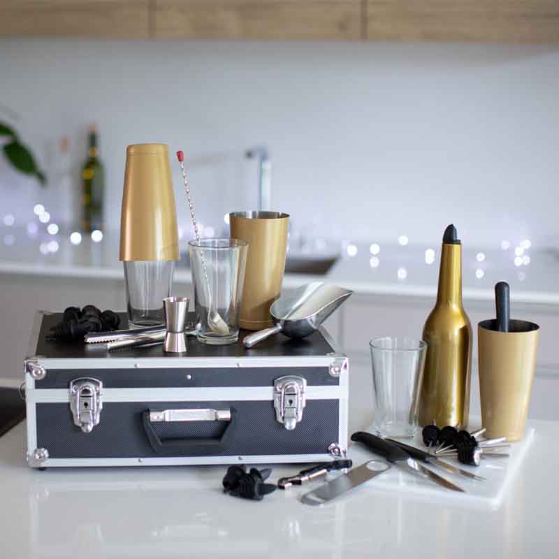 Barmanský kufr sestavený pro práci za barem i pro barmanskou show.