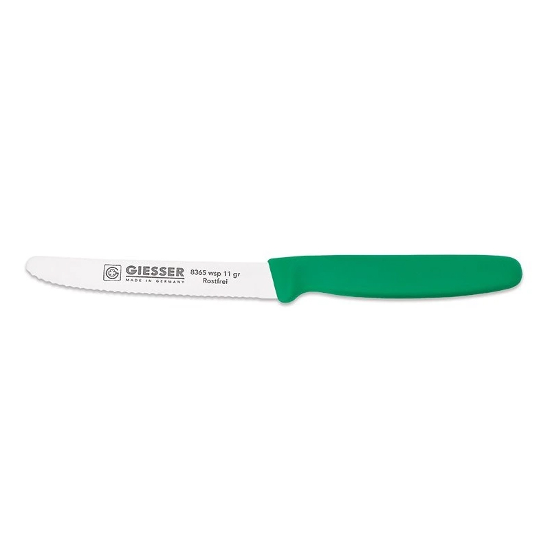 Praktický zubatý barový nůž Giesser s délkou čepele 110 mm, vhodný na krájení menšího ovoce, citronů, limetek atd. Čepel je vnitá, tudíž ji není třeba brousit.