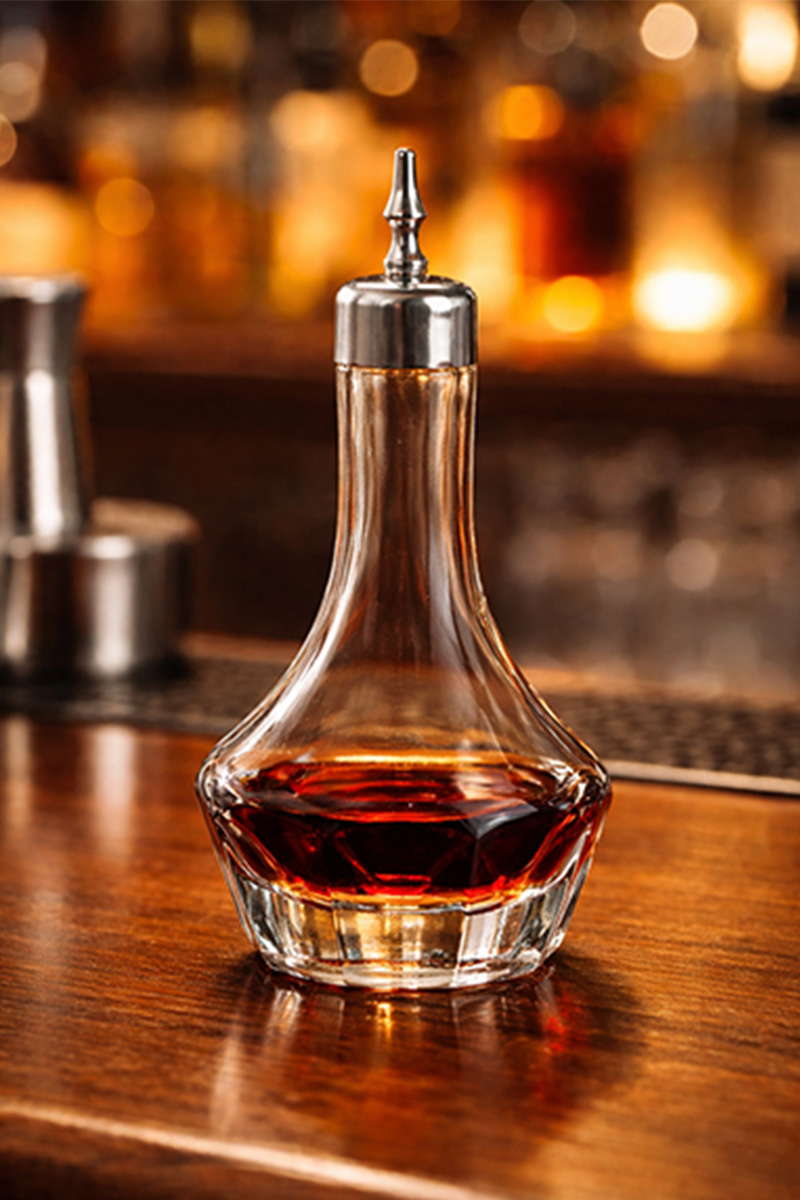 Flakon na bitter DIAMOND o objemu 50 ml s kovovým nalévátkem je vhodný na veškeré bittery a hořké přísady do koktejlů. Nalévátko nemá přisávání jako nalévátka do lahví na alkohol a proto je ideální na střiky a dávkování po kapkách. Flakon je nejen praktický, ale také dekorativní - perfektně doplní barový pult nebo prostřený stůl.