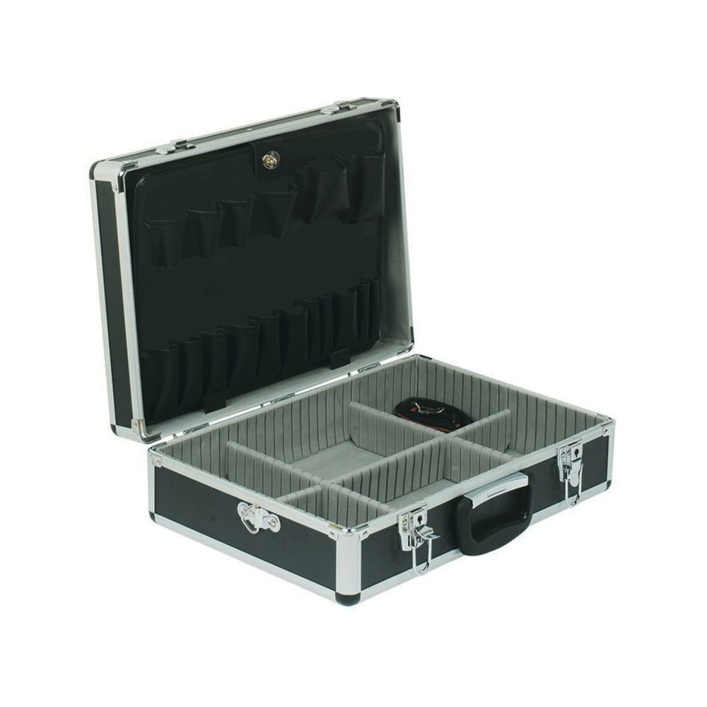 Kufr na barmanské vybavení se stabilním hliníkovým rámem, deskou a pěti flexibilními rozdělovači vnitřního prostoru, zamykatelný.
