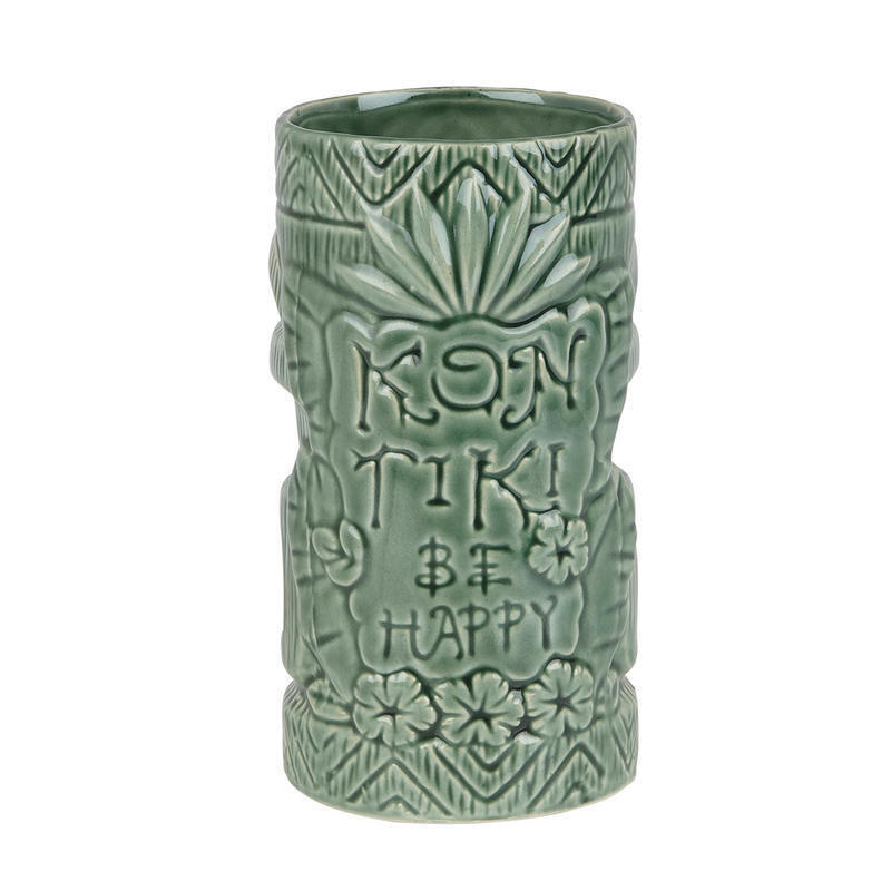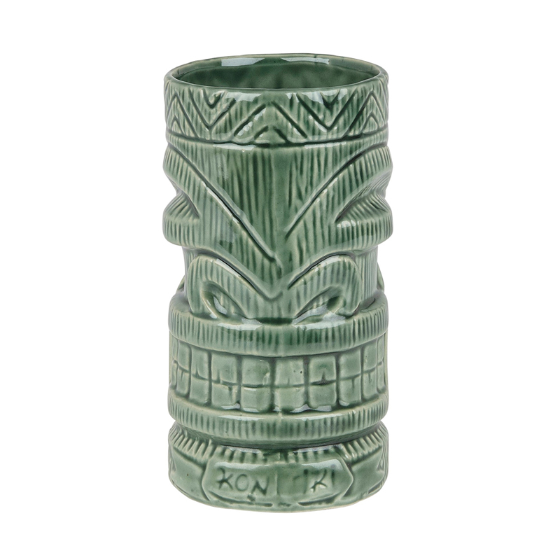 Kon Tiki Mug Green  o objemu 500 ml je keramický hrnek, který se používá na servis tropických TIKI koktejlů jako například Mai Tai nebo Zombie. Tiki koktejly jsou míchané nápoje plné rumů, likérů a čerstvých ovocných šťáv servírovaných právě v keramických Tiki pohárech a bývají bohatě zdobené ovocem všeho druhu.