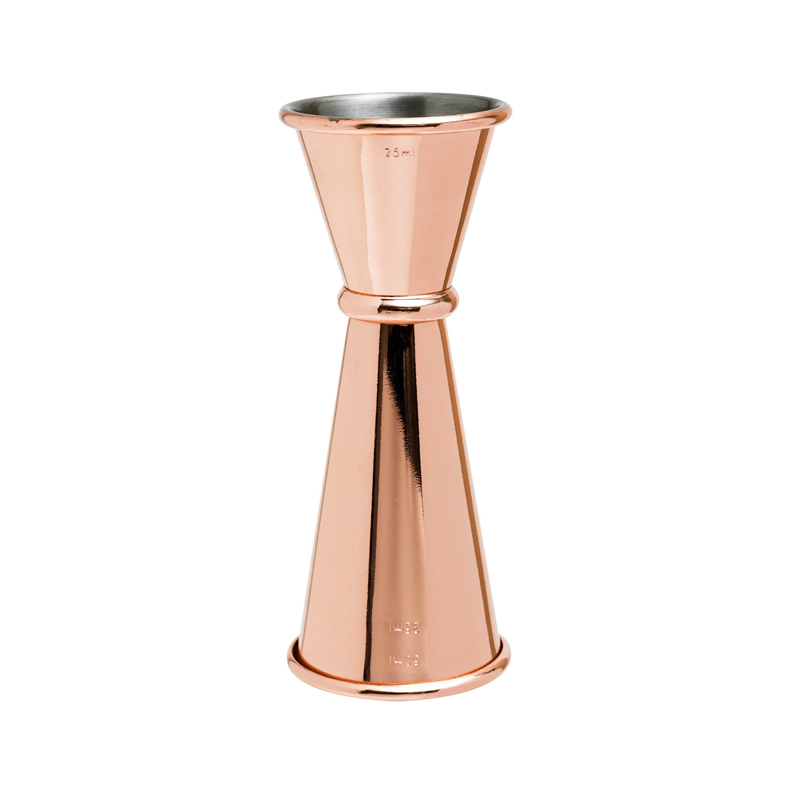Barová odměrka Mezclar v měděném provedení japonského stylu je pro správné odměření a dávkování alkoholu nezbytná věc. Elegantní provedení a zúžený tvar jiggeru zaručuje příjemnou práci. Dva různě velké kalíšky nadávkují tu správnou míru. Větší kalíšek má rysku na 35 ml a plný po okraj nadávkuje 50 ml. Menší kalíšek vnitřní rysku nemá a plný po okraj nadávkuje 25 ml. Barová odměrka je vyrobena z kvalitního potravinářského nerezu.
