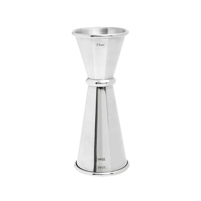 Barová odměrka Mezclar v japonském stylu je pro správné odměření a dávkování alkoholu nezbytná věc. Elegantní provedení a zúžený tvar jiggeru zaručuje příjemnou práci. Dva různě velké kalíšky nadávkují tu správnou míru. Větší kalíšek má rysku na 35 ml a plný po okraj nadávkuje 50 ml. Menší kalíšek vnitřní rysku nemá a plný po okraj nadávkuje 25 ml. Barová odměrka je vyrobena z kvalitního potravinářského nerezu.