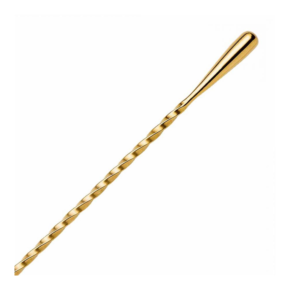 Elegantní míchací lžička s jemným vinutím ve zlatém provedení o délce 30 cm. Nezbytná kamarádka míchací sklenice k přípravě klasických koktejlů. Vinutí v celé délce lžičky je ukončeno frapovací slzou a zabraňuje proklouznutí lžičky v ruce.