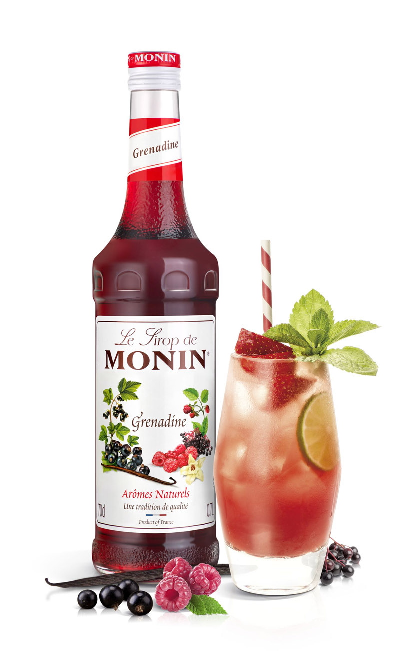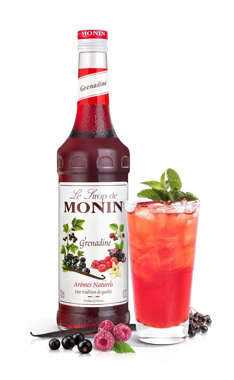 MONIN Grenadina je bezpochyby nejvšestranější a nejpoužívanější sirup v klasickém barmanství a bývá součástí celé řady receptur. Koktejlům obsahujícím Grenadinu propůjčuje výraznou červenou barvu a sladkou, lehce trpkou chuť, ktrerá je velice oblíbená jak u dětí, tak dospělých. MONIN Grenadina bývá často považován za sirup z granátových jablek, ale není to pravda. Chuť je složena z černého rybízu, malin, černého bezu a tóny vanilky.