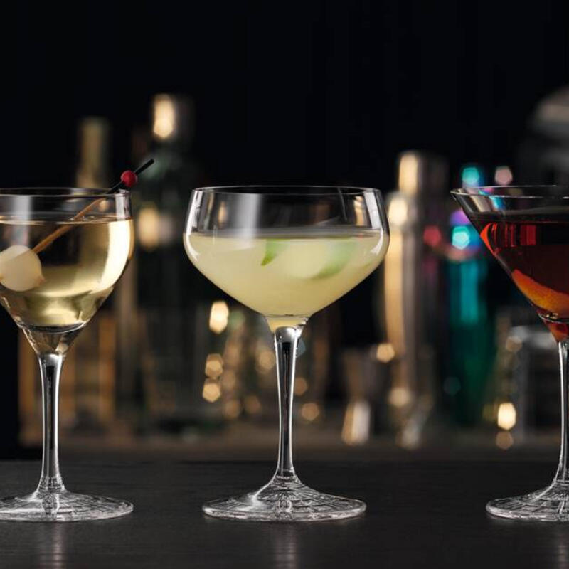 Přestože se tyto tři sklenky od sebe lehce odlišují svým tvarem, všechny tři slouží pro stejný typ koktejlů: krátké drinky servírované bez ledu. Proto je ideální tuto sklenku před podáváním na chvíli vložit do mrazáku a nachladit ji. Ikonická koktejlová sklenka véčkového tvaru se dnes používá pouze na Martini, a tak jí zůstal název Martini Glass. V barech ji nahradila „coupettka“, o níž koluje legenda, že její tvar vznikl podle ňadra Marie Antoinetty. Pravdou však je, že vznikla v Anglii v roce 1663. Poslední z této skupiny je Nick & Nora, která je o něco menší než zbylé dvě.