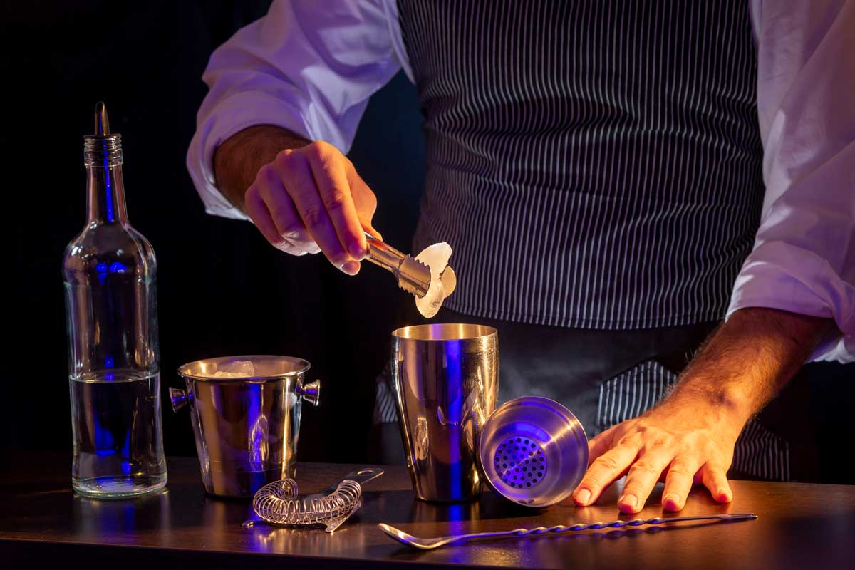 Potřebné barmanské náčiní pro přípravu koktejlu: shaker nebo míchací sklenice, odměrka, vysoká sklenice