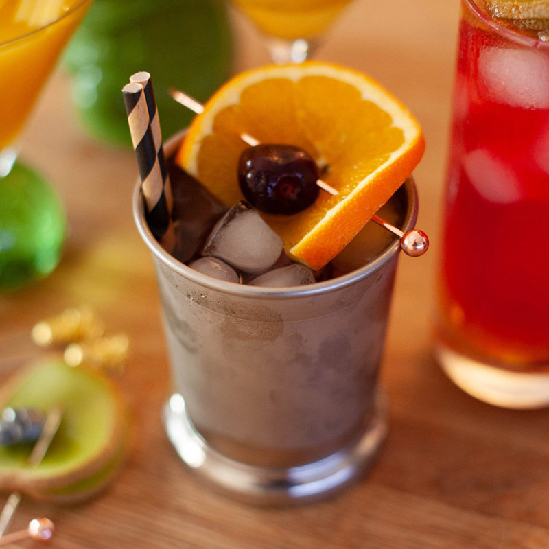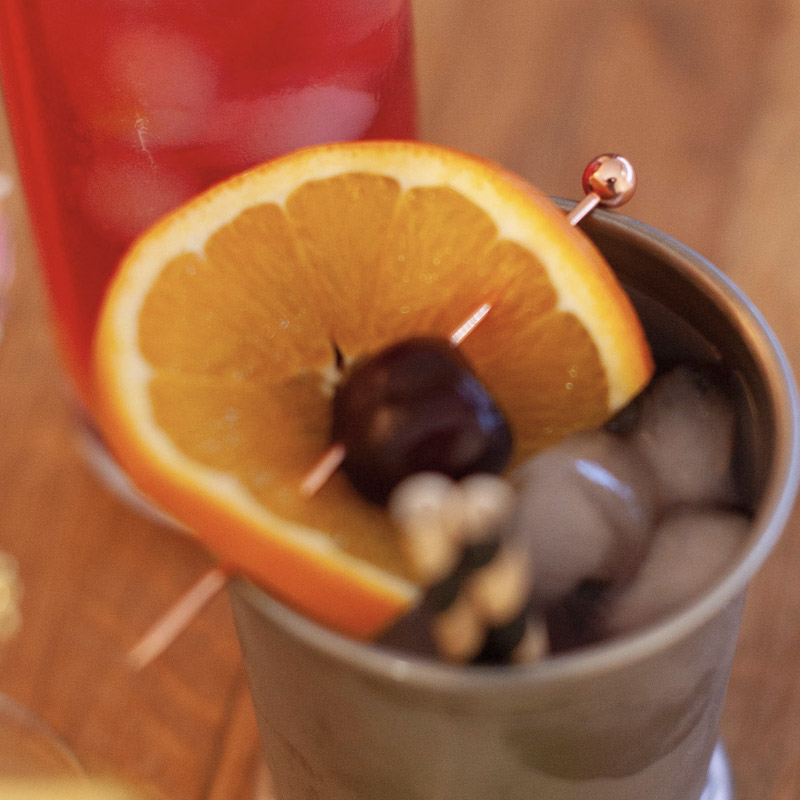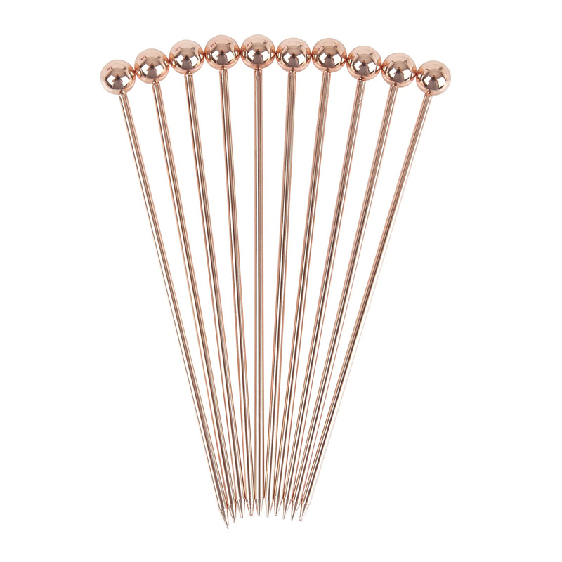 Nerezová napichovátka ANANAS s měděnou povrchovou úpravou o délce 105 mm. Jeden konec napichovátka je hrocený a druhý je ukončen zdobným prvkem ve tvaru koule. Bodce jsou vhodné na ovocné špízky jako ozdoba na koktejly nebo jako napichovátka na olivy a sýry.