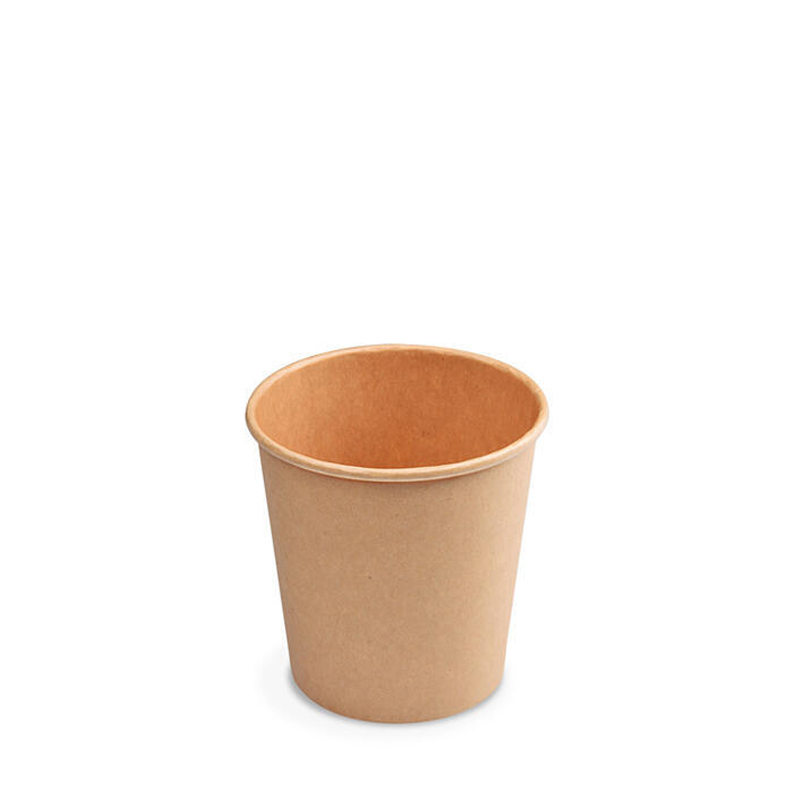 Papírový kelímek na teplé nápoje o objemu 110 ml v hnědé barvě, který je z vnitřní strany potažen PE fólií a je dle normy EU označen piktogramem o obsahu plastu v produktu. Kelímek vydrží s teplým nápojem cca 2 hodiny, potom se můžou jeho vlastnosti měnit. V případě použití na alkoholické nápoje (svařáky nebo punče) se doporučuje alkohol s obsahem do 15%.