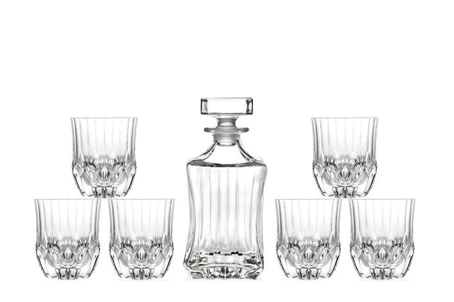 Skleněný set na whisky Adagio, který se skládá z krásně zdobené "broušené" karafy o objemu 750 ml na whisky a 6 designových sklenic o objemu 350 ml z italské sklárny RCR CRYSTAL. Luxusní doplněk vaší kanceláře nebo domácího baru, který bude obdivovat každá návštěva.