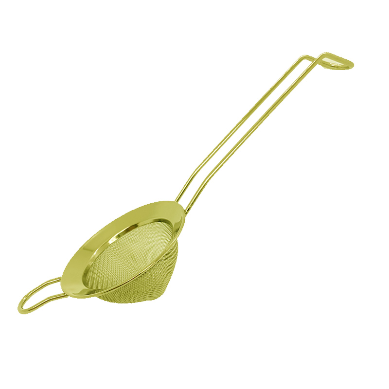 Barové sítko pro doble strain je důležitá pomůcka každého barmana. Slouží k zachycení pevných částic, jako jsou kousky ledu, dužnina z ovoce nebo citrusových plodů, koření atd. Vše, co je v koktejlu nežádoucí, zůstane v jemném sítku a koktejl bude krásně čirý. Barové sítko v zlatém provedení je díky své rukojeti vhodné k zavěšení a své využití najde nejen za barem, ale také v kuchyni a cukrárně.