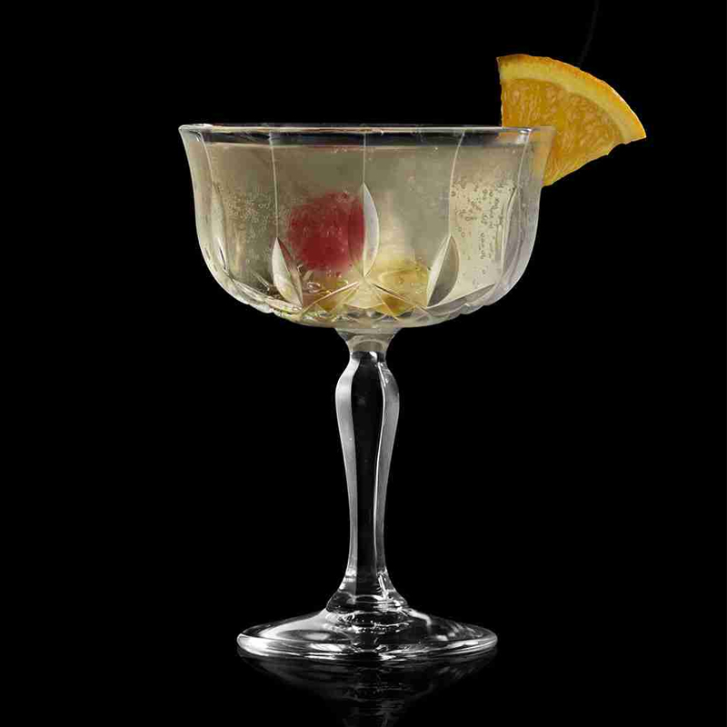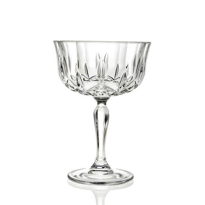 Zdobená lisovaná sklenice kupetka Opera o objemu 240 ml s moderním designem "brusu" z italské sklárny RCR CRYSTAL. Stabilní sklenice s krásně zbobenou nožičkou vhodná pro servis krátkých nápojů nebo jako sklenice na šampaňské.