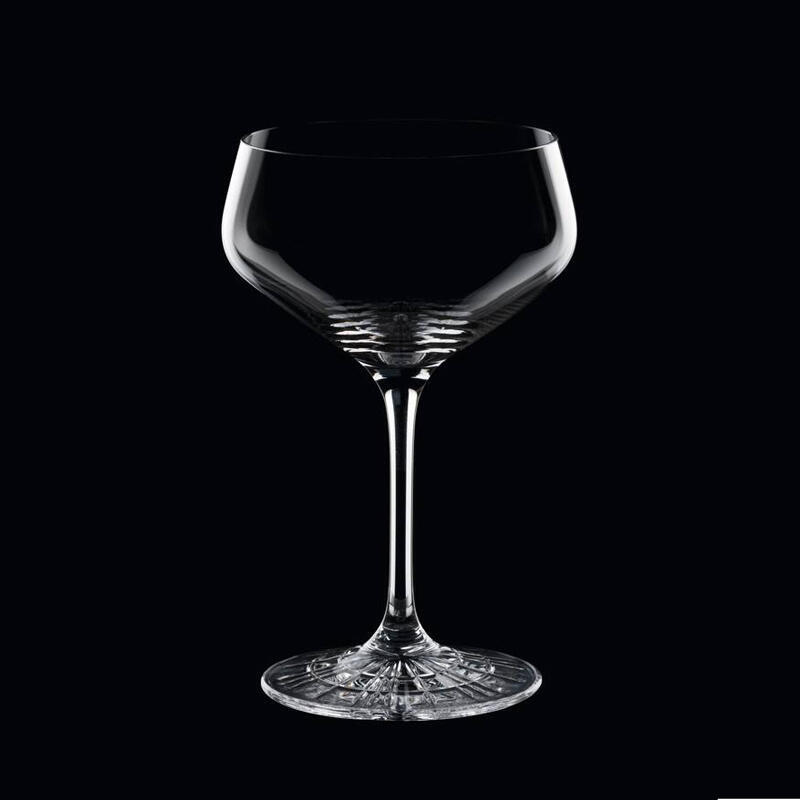 Sklenice kupetka SPIEGELAU Perfect Serve Coupe Glass o objemu 235 ml. Luxusně vyhlížející sklenice z německé sklárny SPIEGELAU vznikla pod taktovkou předního mezinárodně oceněného barmana Stephana Hinze - majitele skvělého baru Little Link. Jak samotný název edice napovídá, jedná se o perfektně vypadající sklenici s lehce uzavřeným tvarem a zdobeným dýnkem o objemu 205 ml. Díky těžké základně a lehkému tělu je sklenice perfektně stabilní až "nepřevrhnutelná".