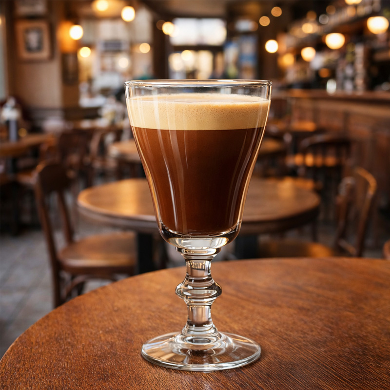 Sklenice na irskou kávu o objemu 177 ml ve vintage stylu. Originální sklenice na irskou kávu ze sklárny LIBBEY na zdobené nézké noze. Sklenice je vhodná také na krátké, nízkoobjemové koktejly.