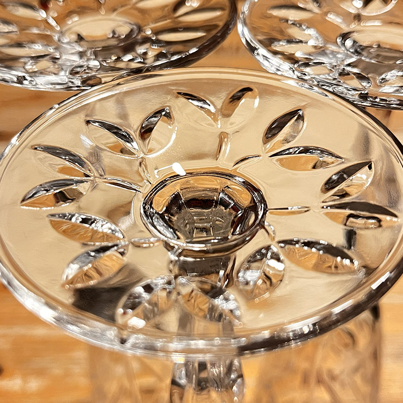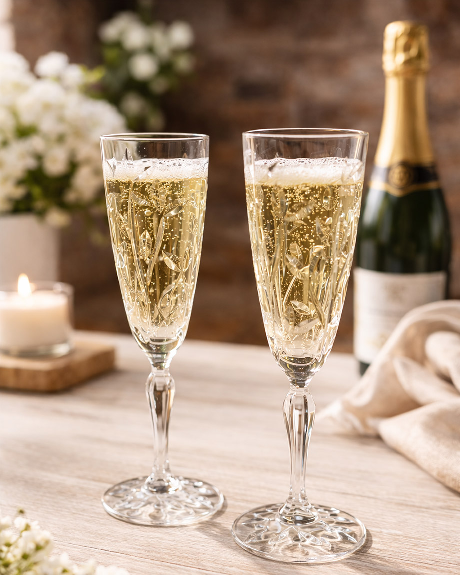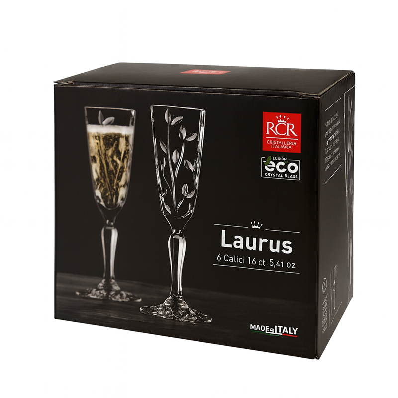 Zdobená lisovaná sklenice na šampaňské Laurus o objemu 160 ml s moderním designem "brusu" z italské sklárny RCR CRYSTAL. Stabilní sklenice s krásně zbobenou nožičkou vhodná pro servis sektu, cavy, šampaňského nebo šampaň koktejly.