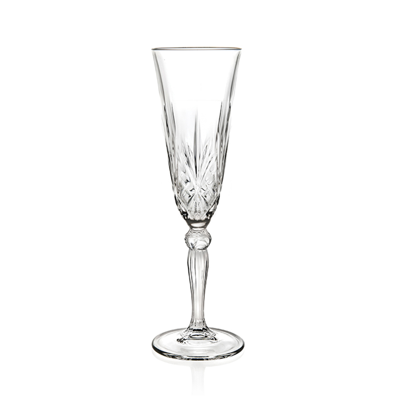 Zdobená lisovaná sklenice na šampaňské Melodia o objemu 160 ml s moderním designem "brusu" z italské sklárny RCR CRYSTAL. Stabilní sklenice s krásně zbobenou nožičkou vhodná pro servis sektu, cavy, šampaňského nebo šampaň koktejly.