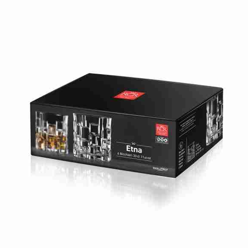 Zdobená lisovaná sklenice na whisky ETNA o objemu 330 ml z itaslké sklárny RCR RYSTAL. Inspirací pro tento design je síla erupce sicilské sopky. Nepravidelné bloky, které tvoří povrch sklenice, zobrazují vyvřelé sopečné magma a dokonalou nedokonalost přírody. Vyrobeno ze 100% recyklovatelného materiálu Luxion®.