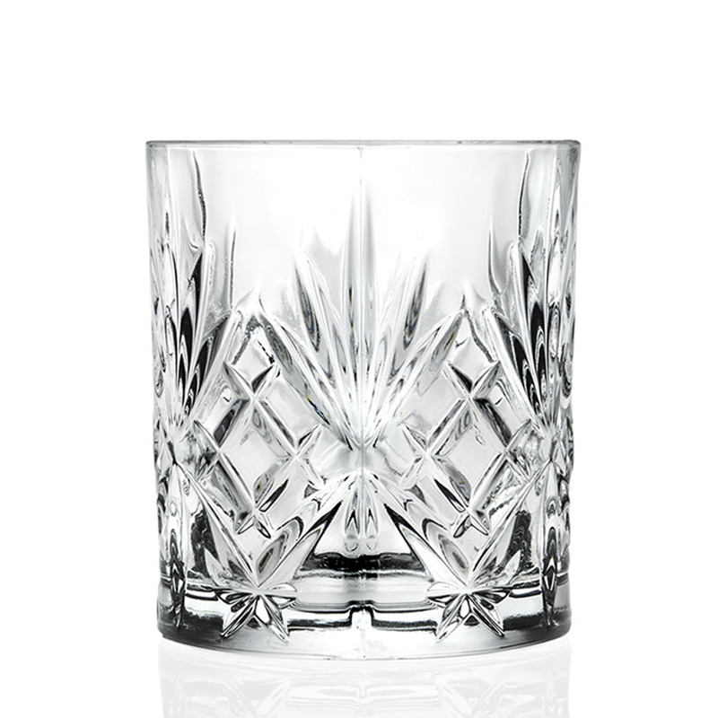 Zdobená lisovaná sklenice na whisky Melodia Whisky D.O.F. 310 ml s moderním designem "brusu" z italské skláry RCR CRYSTAL. Sklenice je určená primárně na podávání whisky, ale je možné jí použít také na jiné destiláty či vodu.