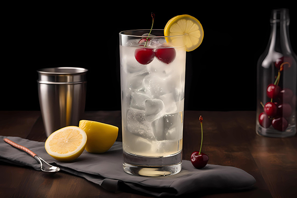 Jak si namíchat Tom Collins: Do sklenice nalijte 5 cl ginu, 2 cl citronové šťávy a 1,5 cl cukrového sirupu. Přidejte kostky ledu a dolijte sodou. Ozdobte plátkem citronu a koktejlovou třešní.