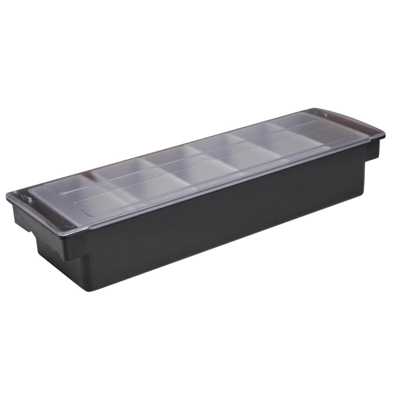 Barový zásobník na ovoce se šesti miskami je vyroben z odolného polykarbonátu, který nepřímá pachy a barviva. Součástí je 6 plastových misek, které lze kombinovat v různých velikostech a mýt v myčce na nádobí. Zásobník lze využít nejen v baru, ale také v kuchyni na koření, zeleninu a všechny možné přísady na vaření. Praktický je plastový poklop, kterým jednoduše po skončení práce zásobník uzavřete.